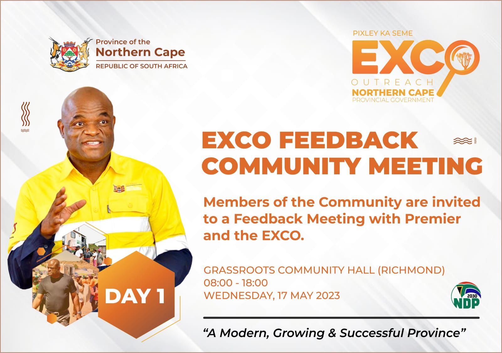 Premier Dr. Zamani Saul, will lead the Exco Feedback Community meeting in Richmond, on Wednesday, 17 May 2023.